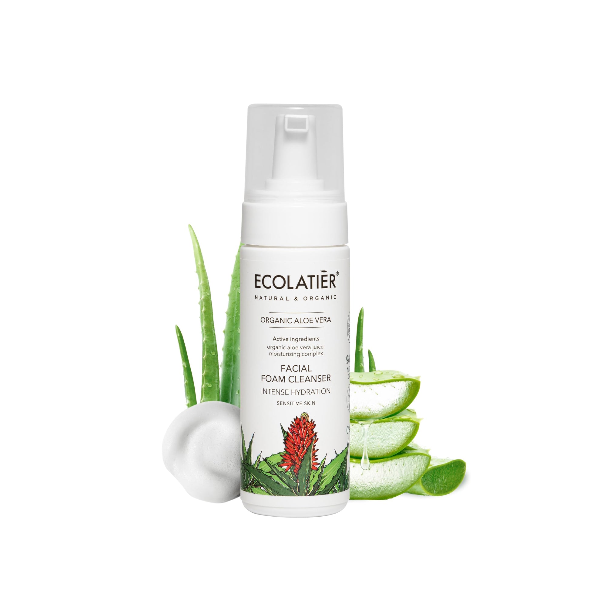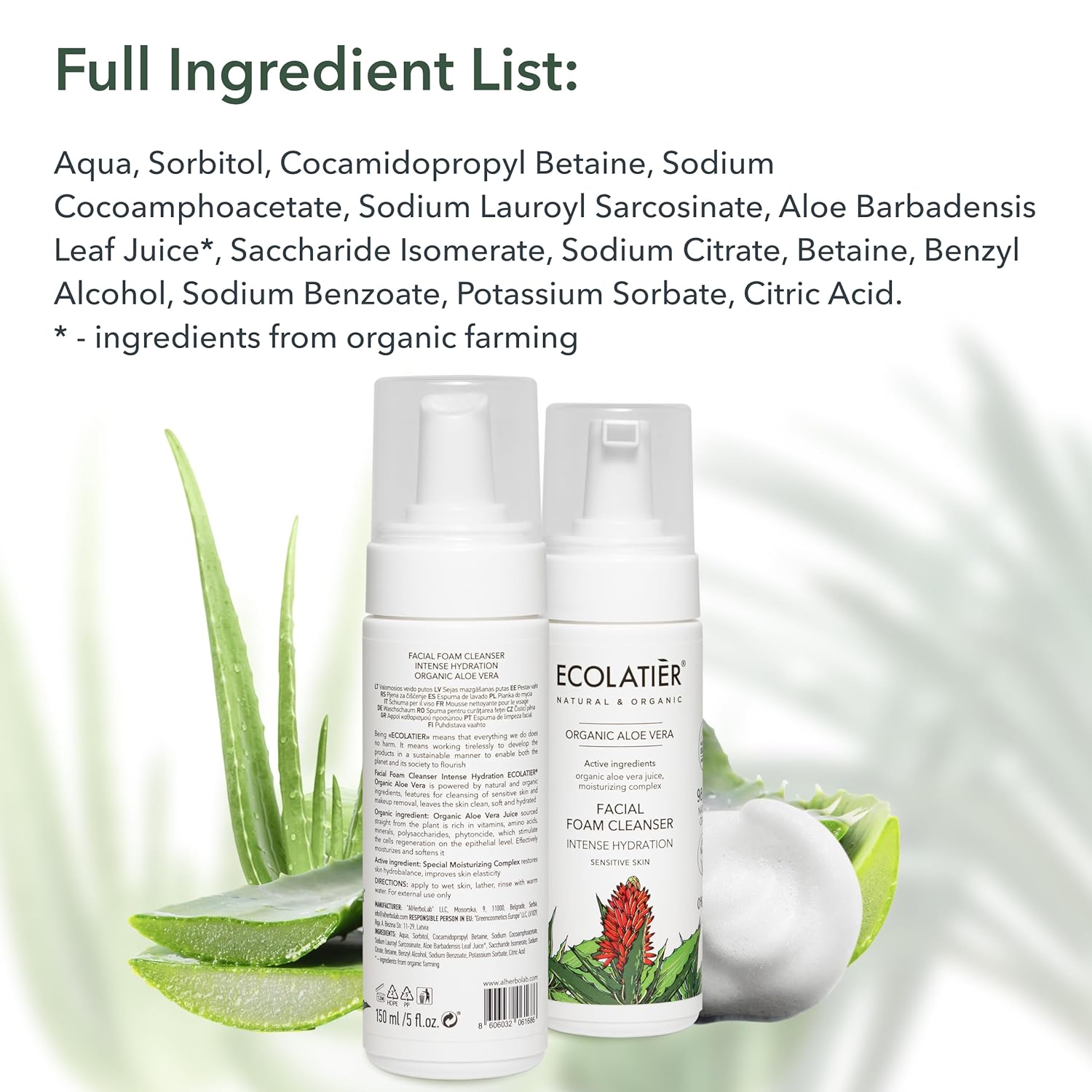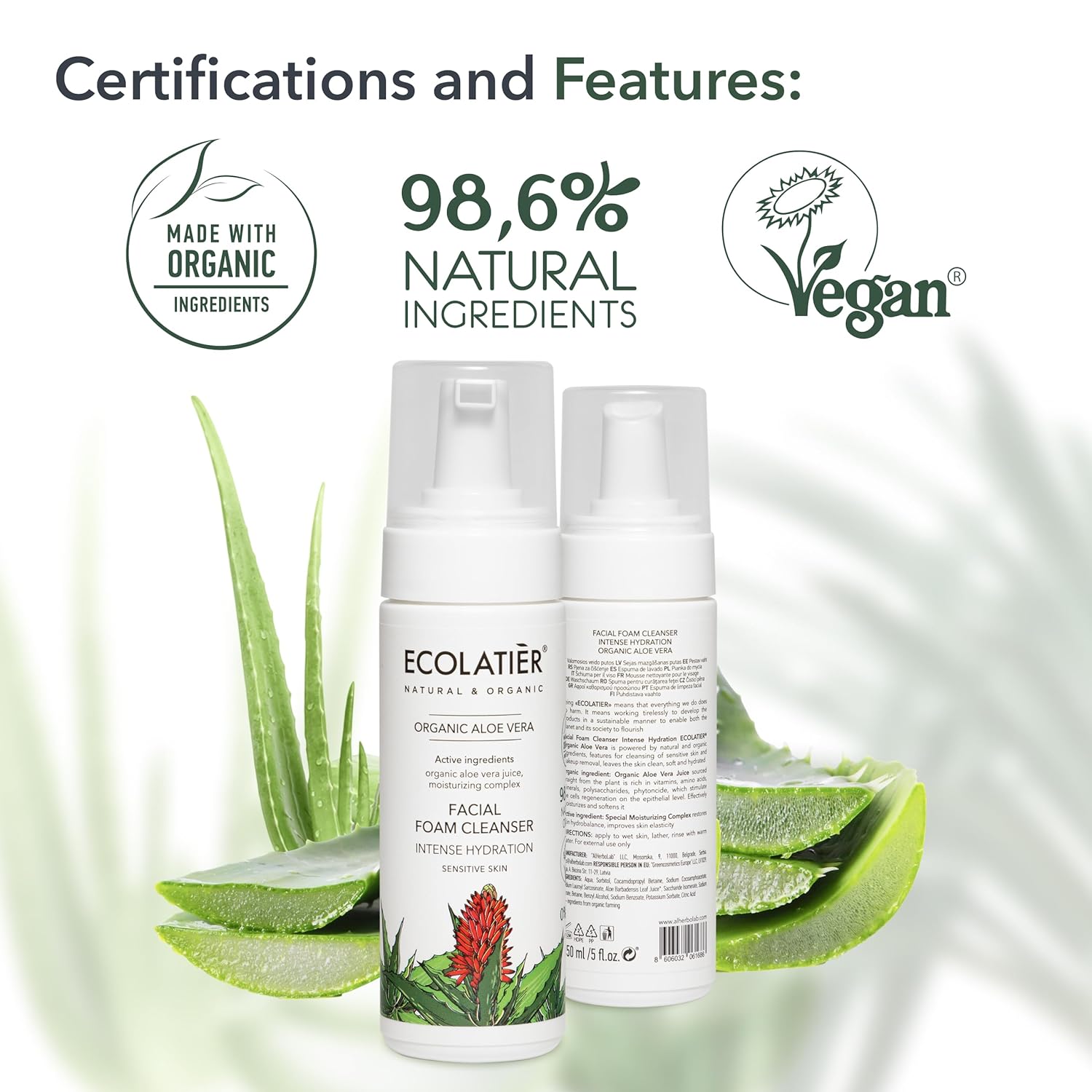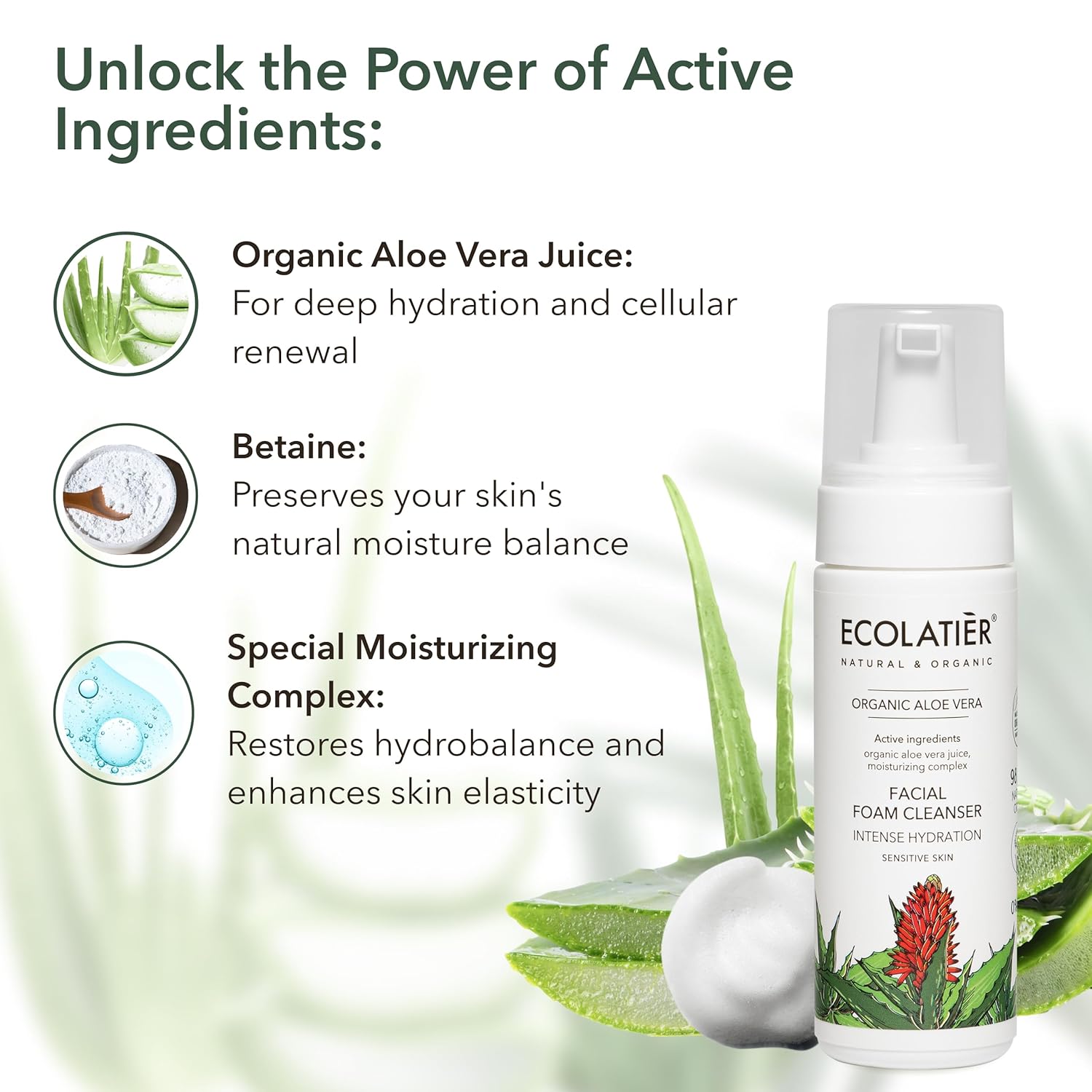 Intensive Hydration Facial Foam Cleanser ECOLATIER - Organic Aloe Vera, 98.6% Natural, Vegan - Deeply Moisturizes and Effectively Removes Makeup - 5.1 Fl Oz